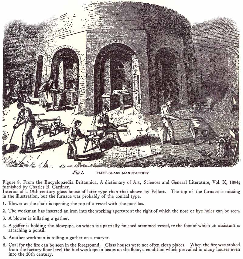 This early drawing illustrates a lot of the operations that I have covered above and is a good illustration of the 1800’s glass house. Click the image for an enlargement.